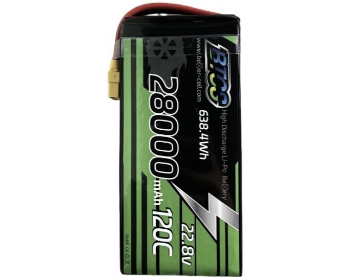 容量:28000mAh 倍率:120C 电压:22.8 厚度:≤68mm 宽度:≤92mm 高度:≤205mm 重量:<2306g